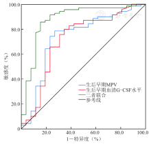 图1. 生后早期MPV及血清G-CSF水平预测BPD超早产儿首次拔管后72 h内撤机失败的ROC曲线图注:MPV为平均血小板体积,G-CSF为粒细胞集落刺激因子,BPD为支气管肺发育不良,ROC曲线为受试者工作特征曲线
